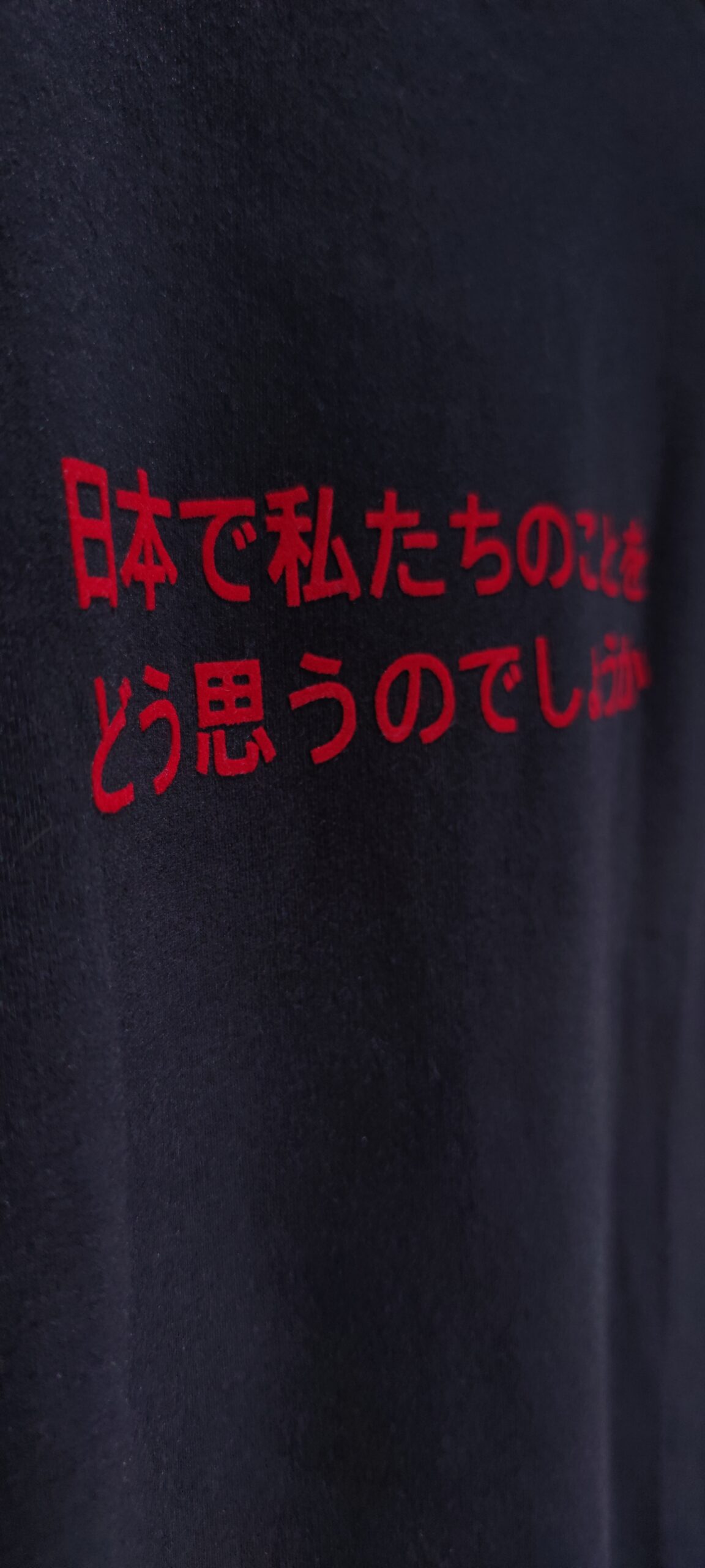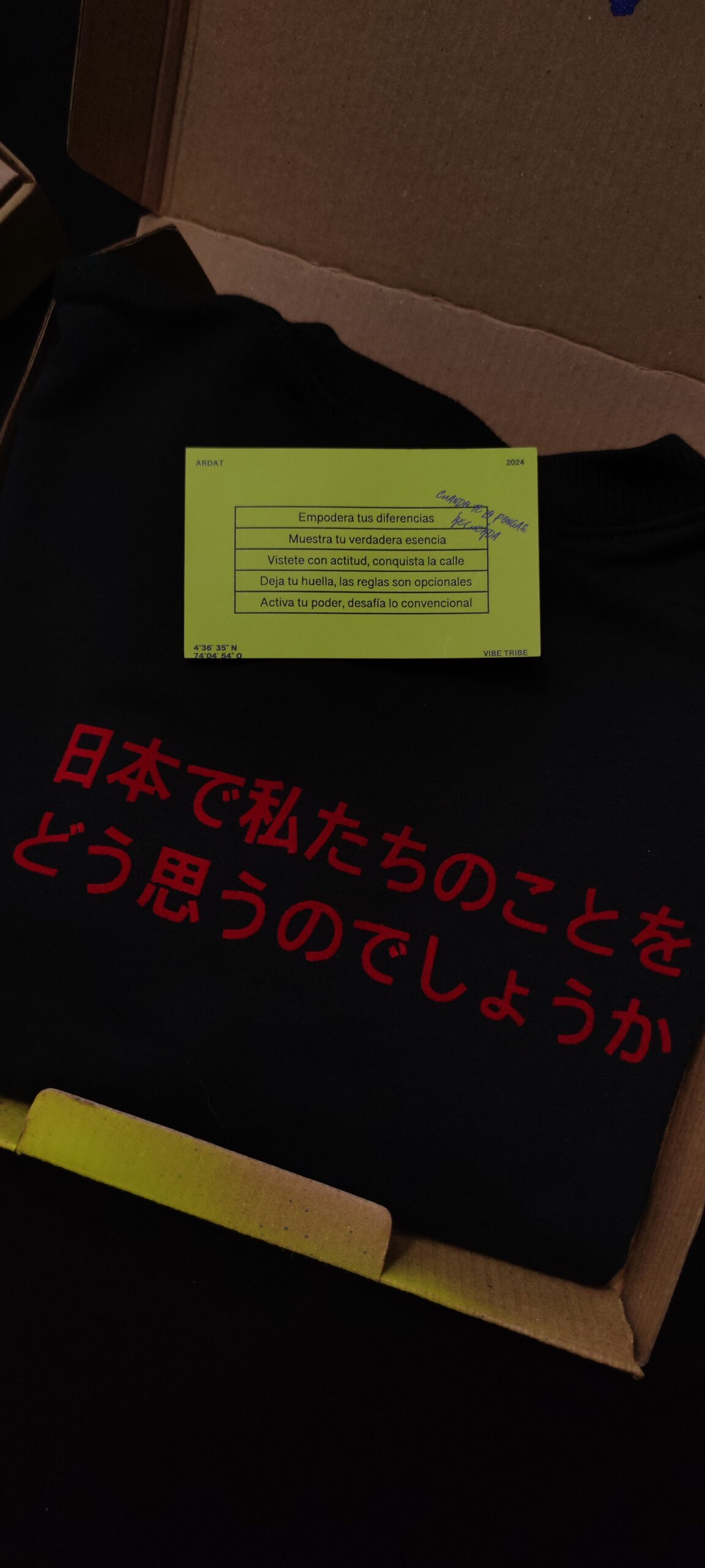Crop top negro en burda, con logo ARDAT al frente y texto en japonés en la espalda. “¿Qué pensarán de nosotros en Japón?”. Una prenda de textura suave, corte amplio, cuello redondo y caída recta. Aporta contraste a cualquier conjunto, es ideal para usar sola o en capas.