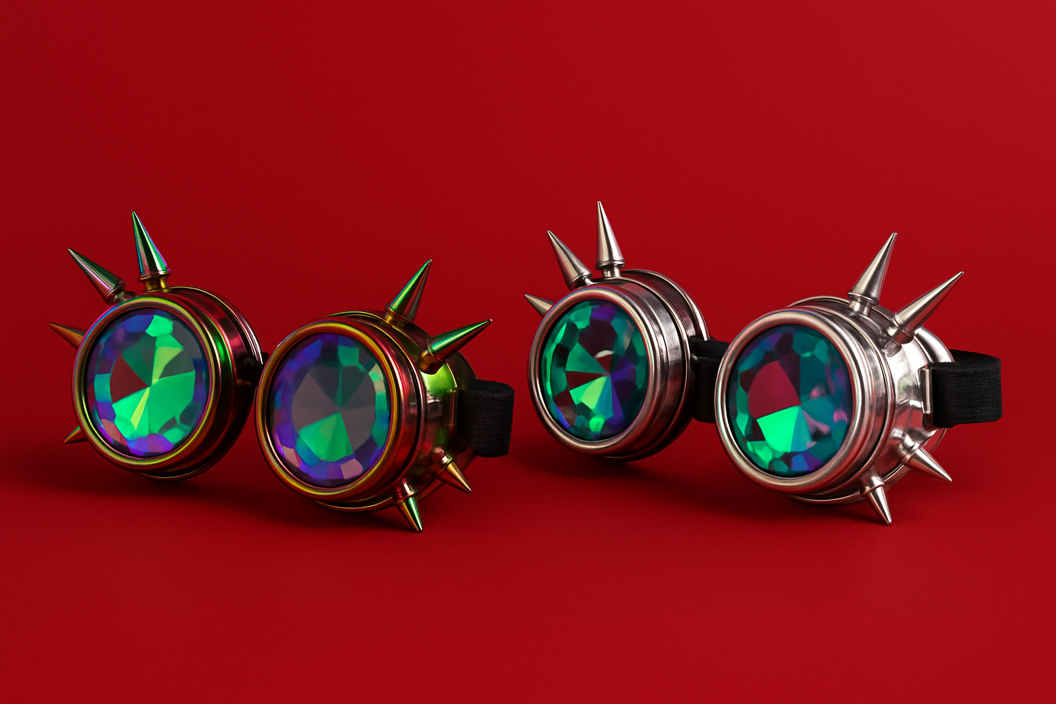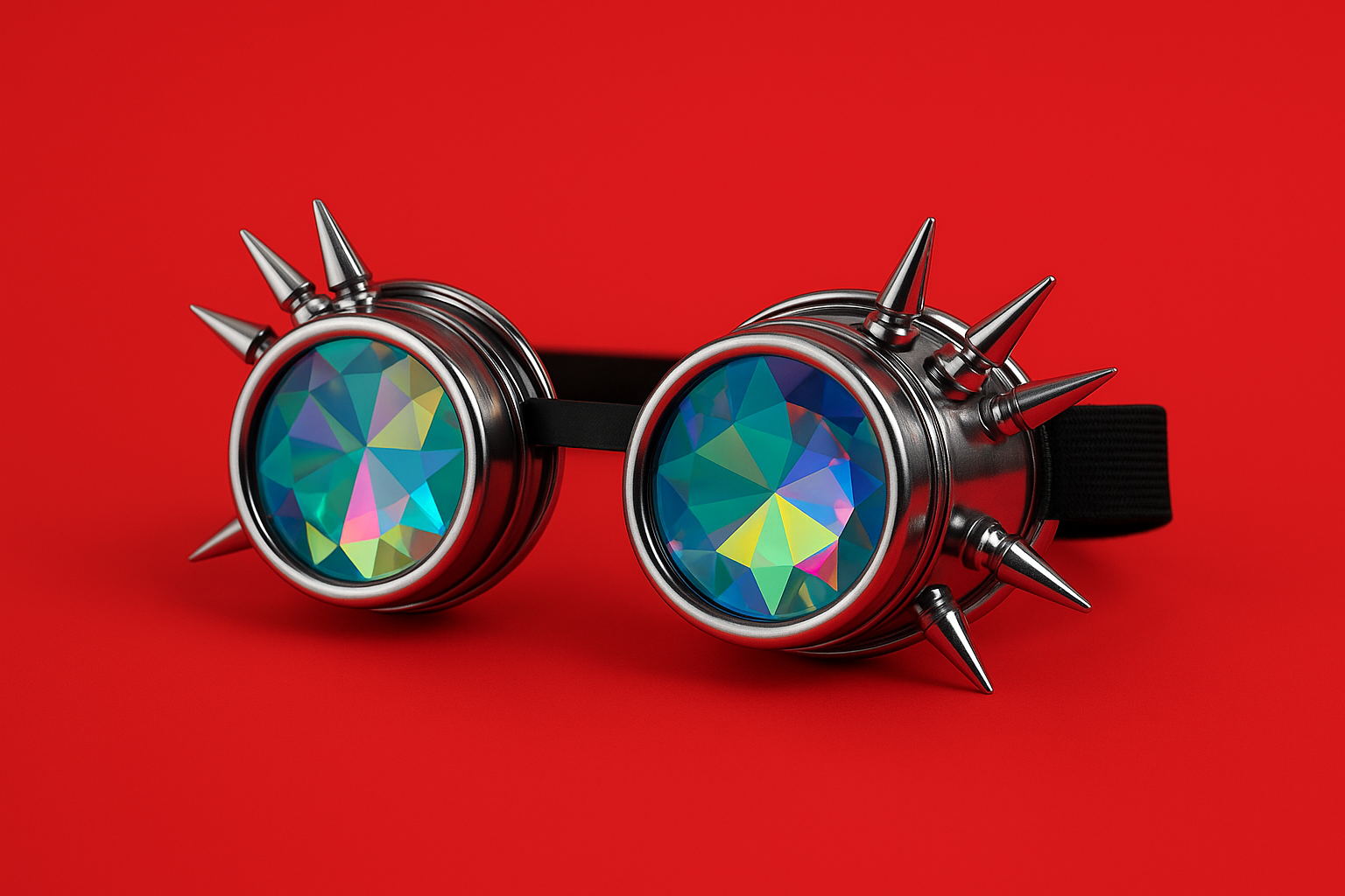 Gafas con lentes caleidoscópicos que multiplican luz y color. Uso decorativo, ideales para festivales, sesiones fotográficas o performance. No ópticas. Accesorio de estética experimental.
