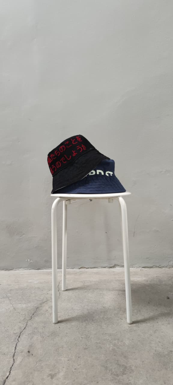 Gorro doble faz: un lado negro con el texto en japonés. “¿Qué pensarán de nosotros en Japón?” la textura tipo gamuza del estampado resalta sobre el fondo oscuro, reverso azul petróleo con estampado fotoluminiscente que brilla en la oscuridad al cargase cpon luz natural o artificial. Diseño urbano con detalle técnico. Talla única.